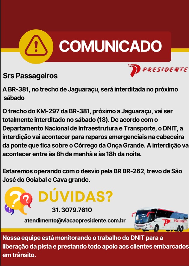 A empresa informa o seguinte: “Estaremos operando com o desvio pela BR BR-262, trevo de São José do Goiabal e Cava Grande. Nossa equipe está monitorando o trabalho do DNIT para a liberação da pista e prestando todo apoio aos clientes embarcados em trânsito”. Em caso de dúvidas, as formas de contato são pelo telefone 31. 3079.7610 e por e-mail [email protected] .