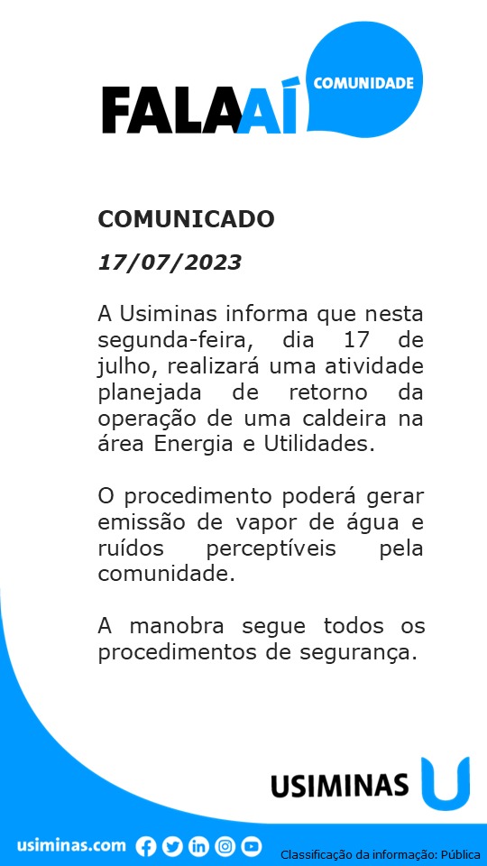 Usiminas, uma das maiores siderúrgicas do Brasil, anunciou que nesta segunda-feira, dia 17 de julho, conduzirá um procedimento programado para reativar uma caldeira na sua unidade de Energia e Utilidades.