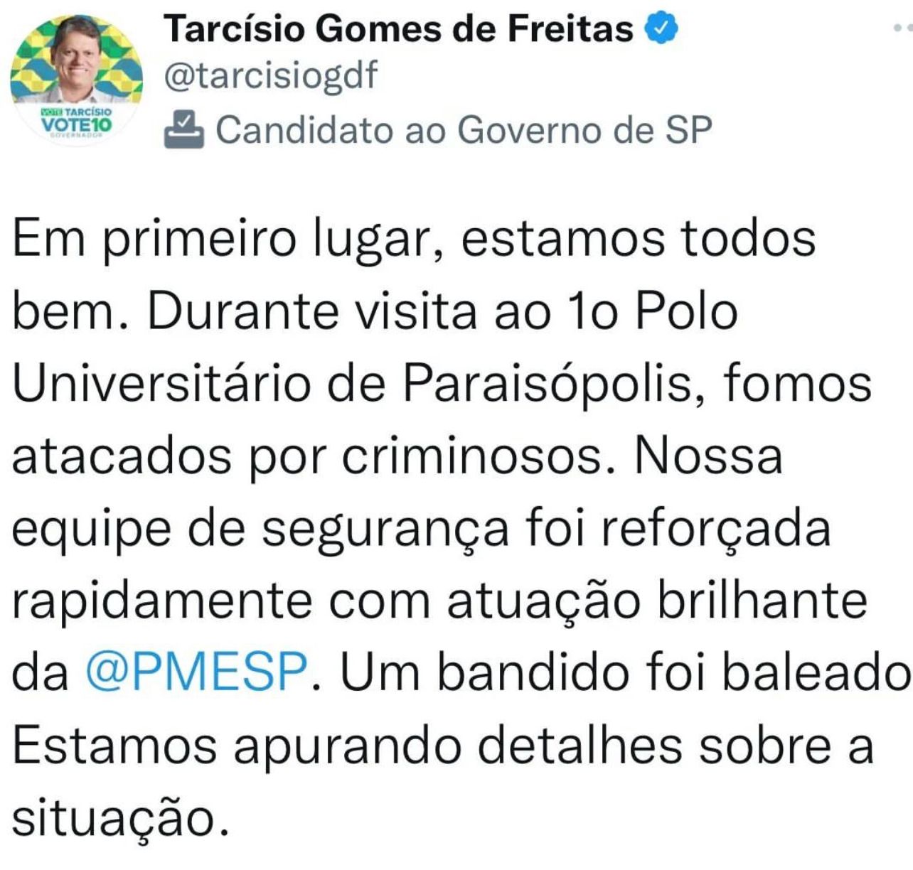 Nas redes sociais, o candidato informou que estão todos bem. “Durante visita ao primeiro polo universitário de Paraisópolis, fomos atacados por criminosos”, escreveu. Tarcísio ainda afirmou que a polícia agiu rápido para ajudar.