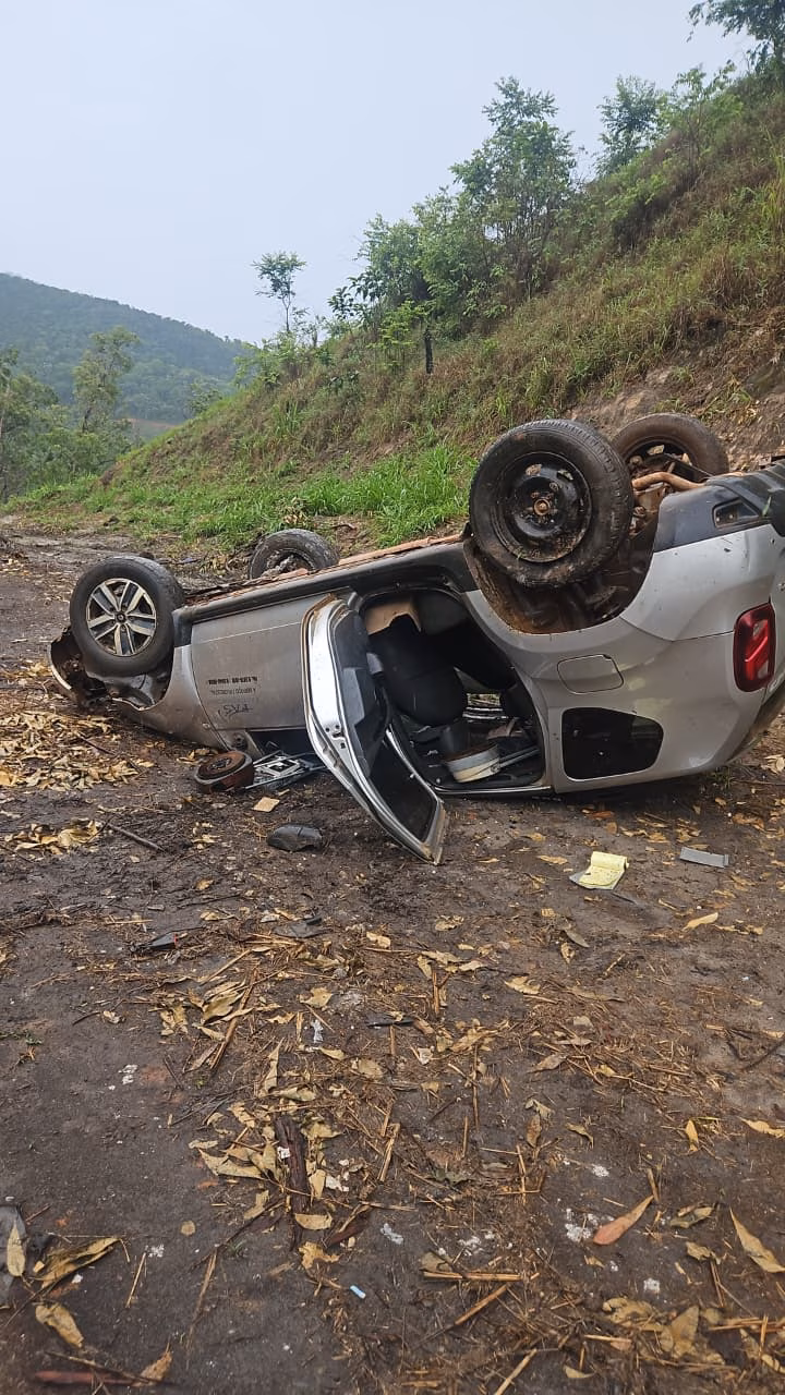 Nesse trecho, o motorista perdeu o controle da direção e capotou o Duster para fora da pista. Após o acidente, ele foi contido e detido pelos policiais militares.
