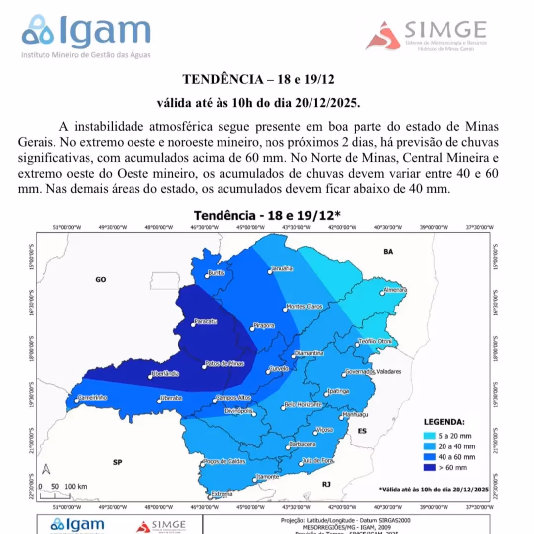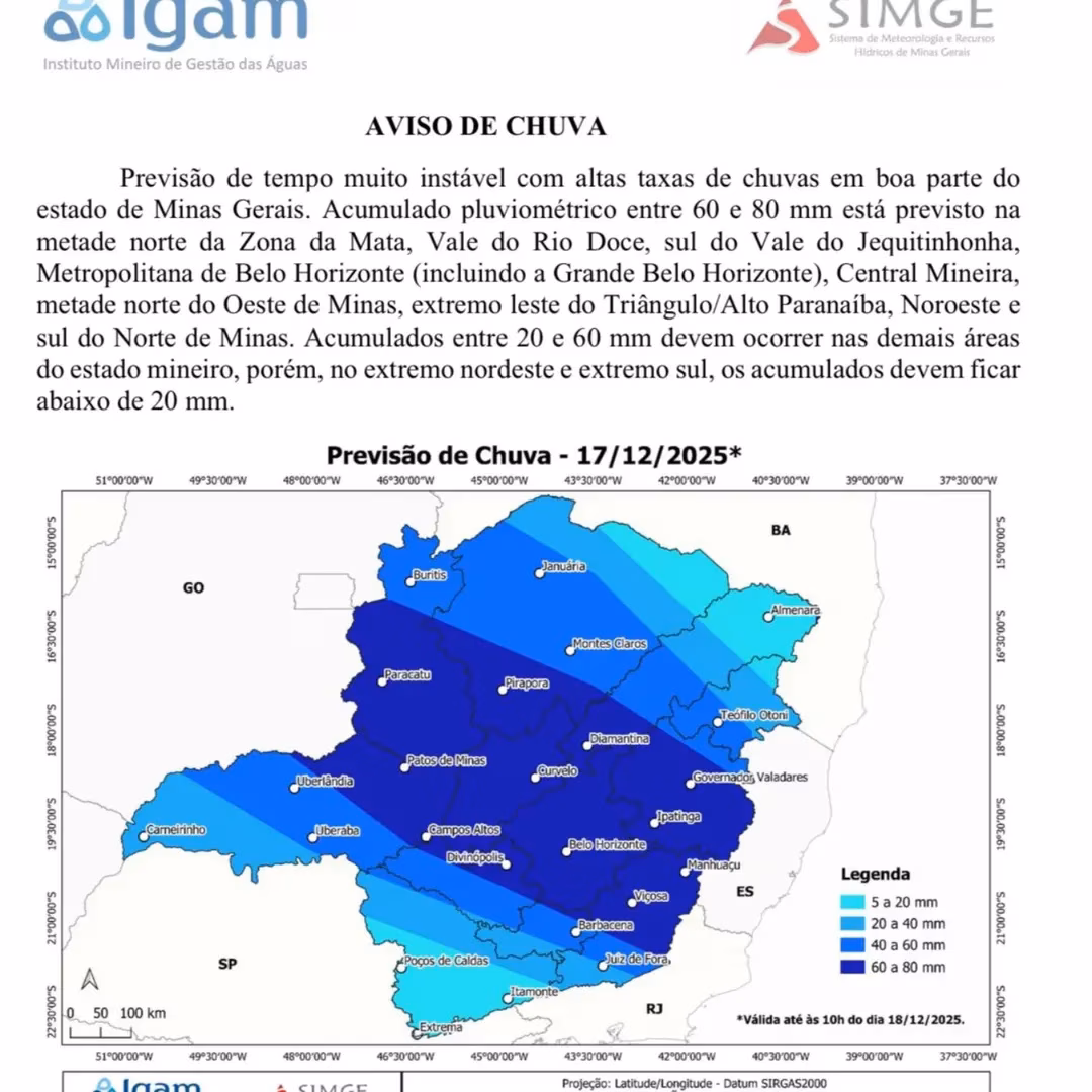 O Sistema de Meteorologia e Recursos Hídricos de Minas Gerais (SIMGE/IGAM) emitiu alerta para a região do Vale do Aço, com previsão de chuva entre 60 mm e 80 mm, válida desta quarta-feira (17/12) até às 10h de quinta-feira (18/12).