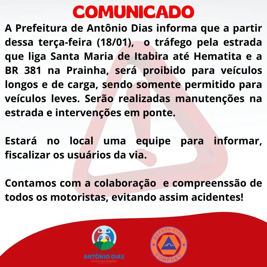 Segundo a Prefeitura, a partir desta terça-feira (18), está proibido o tráfego de veículos longos e pesados pela estrada de Santa Maria de Itabira para Hematita até a BR-381, na Prainha. Serão permitidos apenas veículos leves.