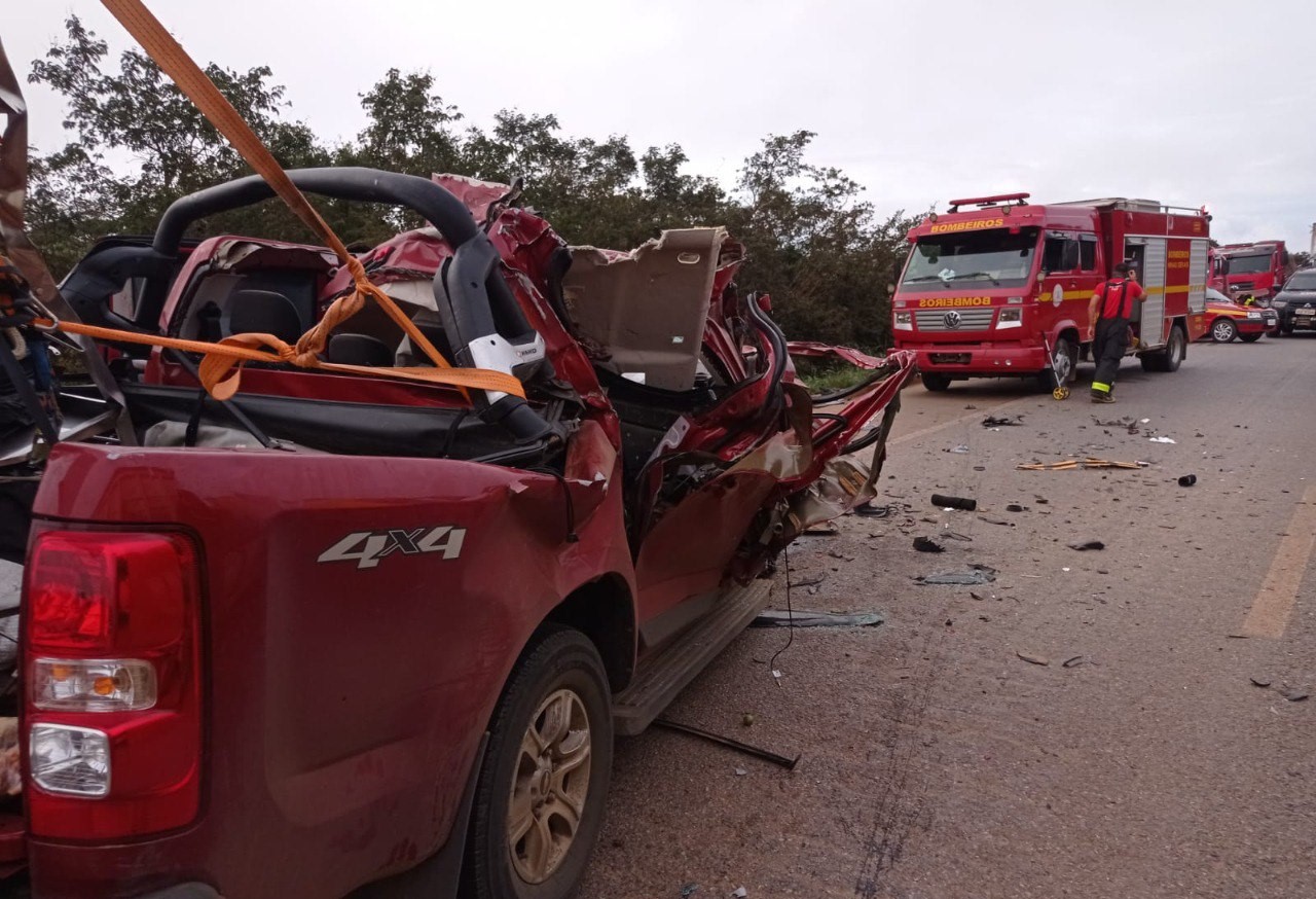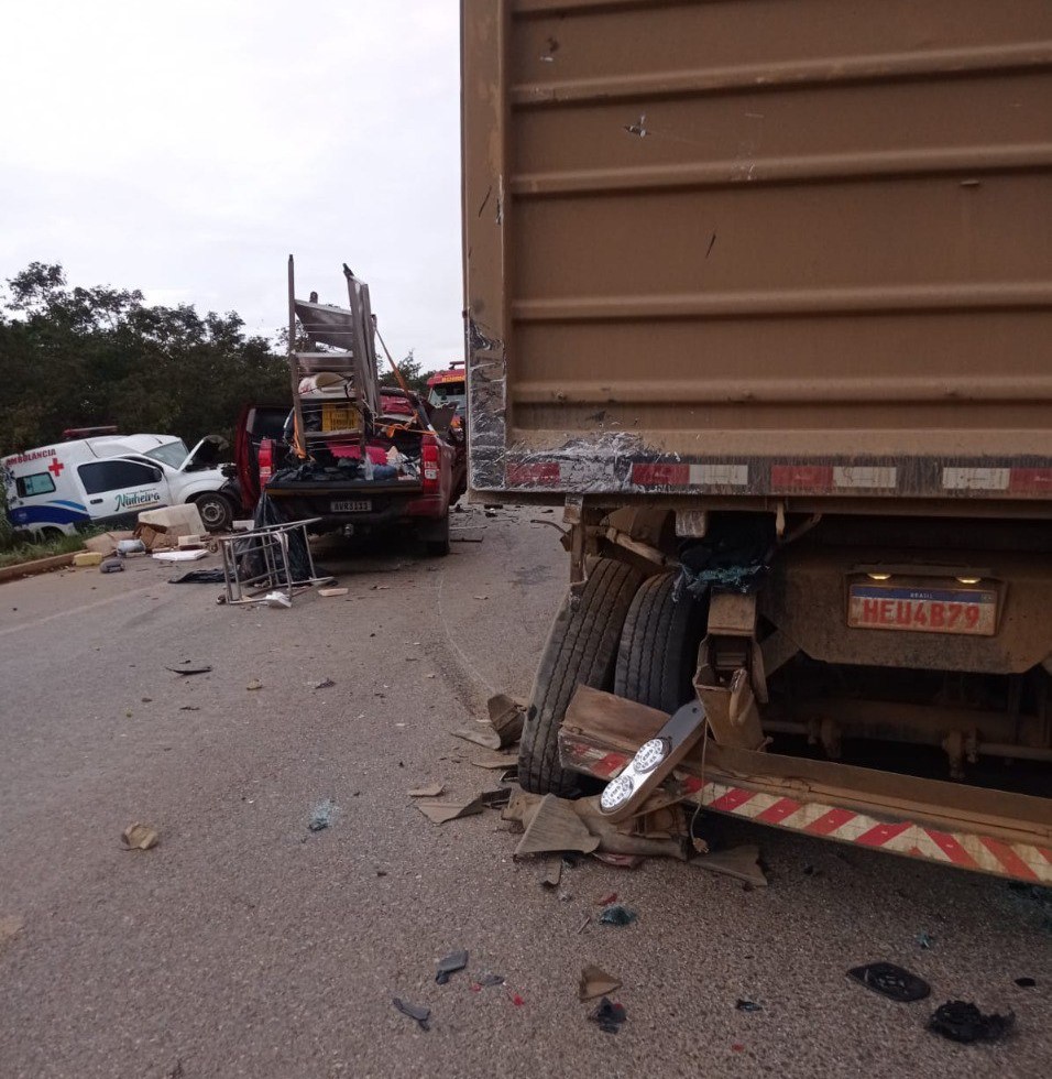 Na madrugada desta sexta-feira (18), um acidente envolvendo uma caminhonete, uma carreta e uma ambulância matou dois homens e deixou outros dois feridos no km 464 da BR-251. As duas vítimas fatais estavam na caminhonete.