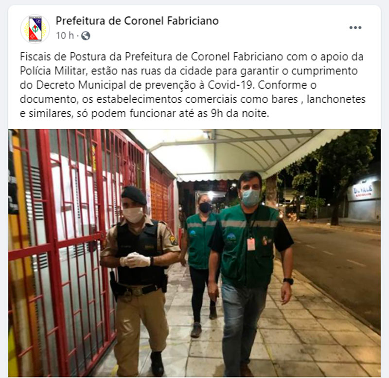 O setor de Fiscalização da Prefeitura de Fabriciano está funcionando em parceria com a Vigilância Sanitária e Polícia Militar, inclusive com equipes atuando em regime de plantão nos finais de semana e feriados. O apoio da população é fundamental em enviar denúncias de irregularidades e aglomeração de pessoas ao órgão. As penalidades variam desde a notificação, multa de 500 UPFCF (Unidade Padrão Fiscal de Coronel Fabriciano – em torno de R$ 1.200) que pode dobrar em caso de reincidência até a suspensão do alvará de funcionamento e sanitário.