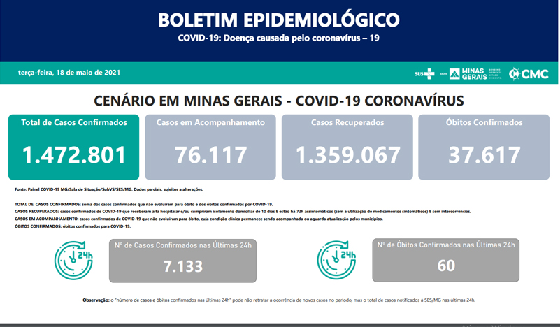 Também foram confirmados mais 7.133 casos da doença, totalizando o número de 1.472.801 casos desde o início da pandemia. Com os novos óbitos, Minas contabiliza 37.617 vidas perdidas para o vírus. Do número total de infectados, 1.359.724 já foram considerados recuperados.
