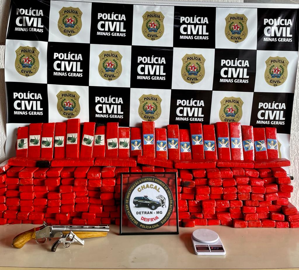 As investigações, realizadas pelos policiais da Divisão Especializada em Prevenção e Investigação de Furtos e Roubos de Veículos (DEPIFRVA), que integra o Departamento Estadual de Investigação de Crimes de Trânsito (DEICTRAN), resultaram na apreensão de 203 barras de maconha, totalizando mais de 140 kg da droga, além de duas armas de fogo, uma balança de precisão e um caderno com anotações. Segundo o delegado Domiciano Monteiro, chefe da DEPIFRVA, os trabalhos se iniciaram há três meses. “Essa investigação tem como foco grupo organizado envolvido com furtos e roubos de veículos, contudo apuramos que eles também comandam grande esquema de tráfico de drogas no estado de Minas Gerais”, explicou.