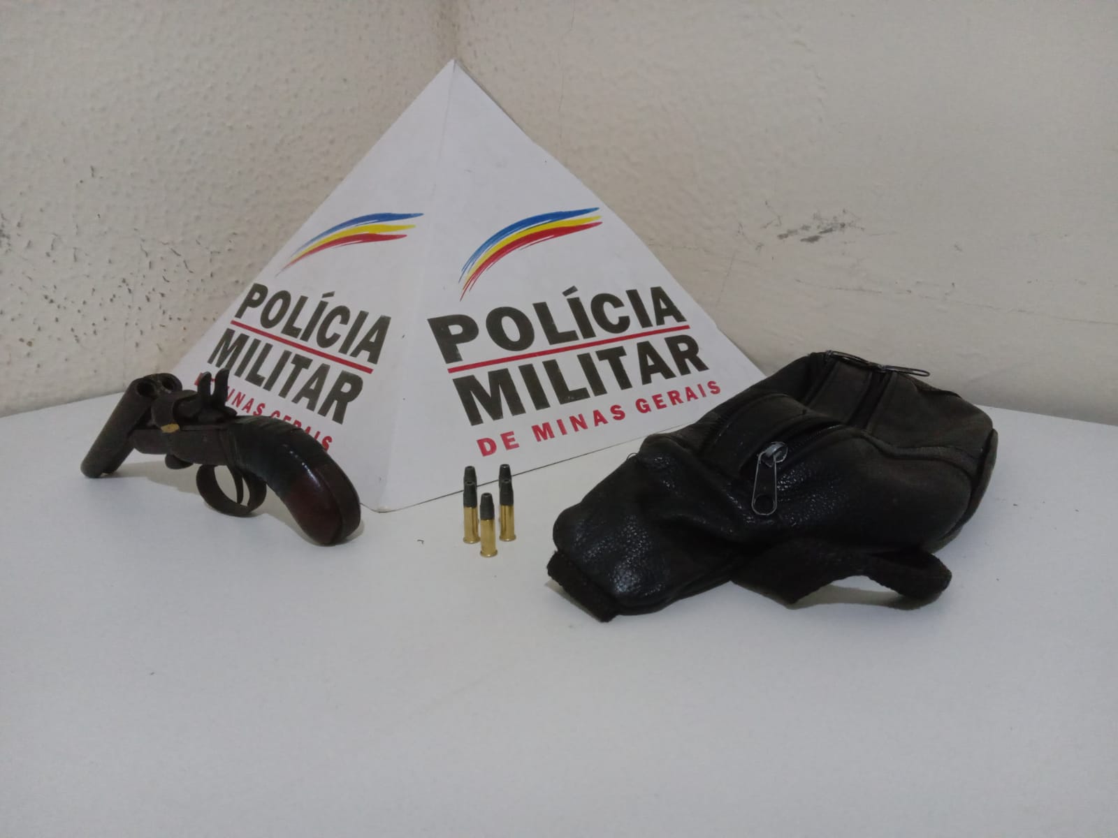 Conforme os policiais, com o suspeito foi localizado uma pochete, contendo uma arma de fogo calibre .22, do tipo garrucha, e cinco munições, do mesmo calibre. O acusado possui passagens policiais acusado de roubo, homicídio e receptação.