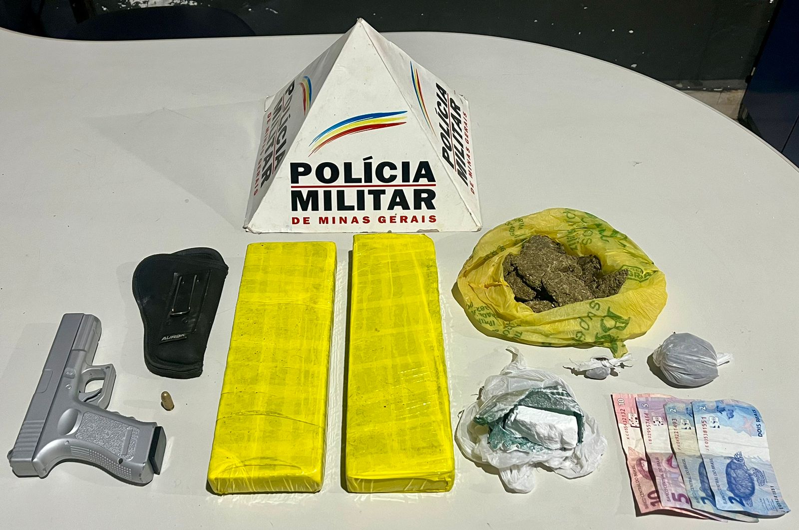 Durante as diligências complementares, a polícia apreendeu diversos itens ilícitos, incluindo duas barras de maconha, uma porção de cocaína, duas porções de maconha, uma bucha de maconha, uma munição calibre 9mm, um simulacro de pistola, um coldre e R$ 19,00 em espécie.
