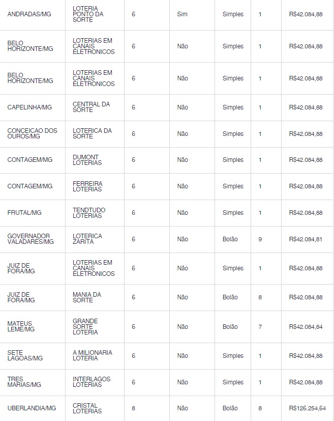 A quina teve 189 ganhadores, com prêmio individual de R$ 42.084,88. Sendo 15 apostas vencedoras em Minas Gerais. Acertaram quatro números 12.204 apostadores, que receberão cada um, R$ 931,08.