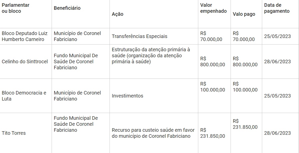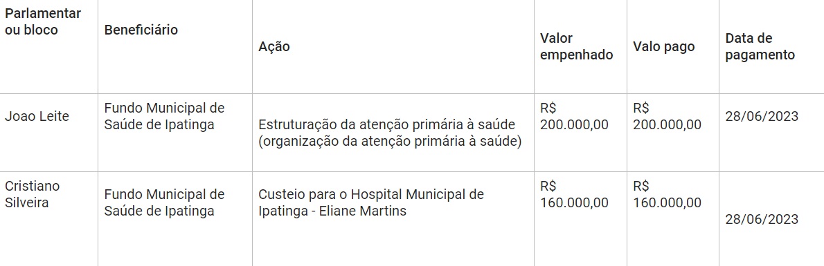 Neste ano de 2023, os municípios de Ipatinga, Coronel Fabriciano e Timóteo, todas no Vale do Aço, foram beneficiadas de forma direta. Ipatinga recebeu R$ 360 mil, Timóteo R$ 630 mil e Fabriciano R$ 1.201.850,00.