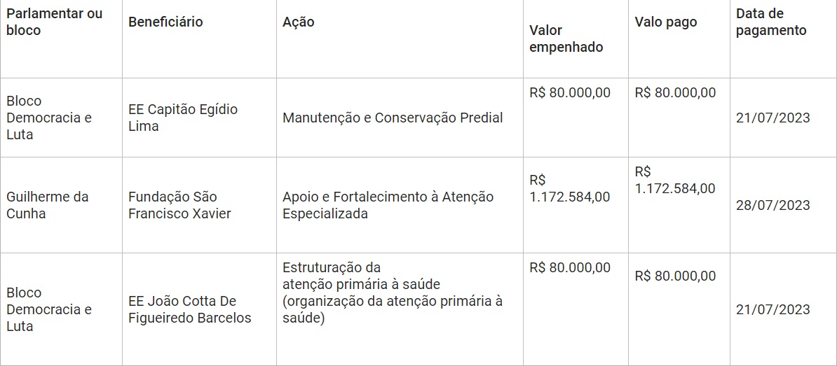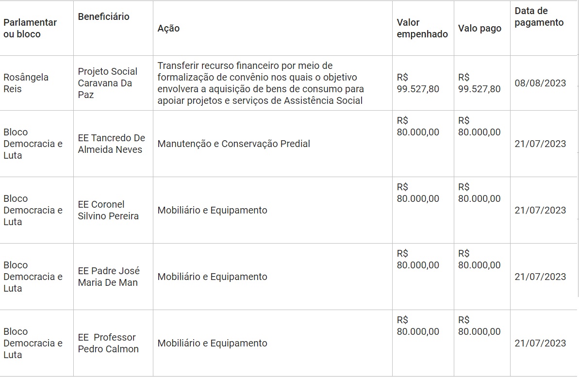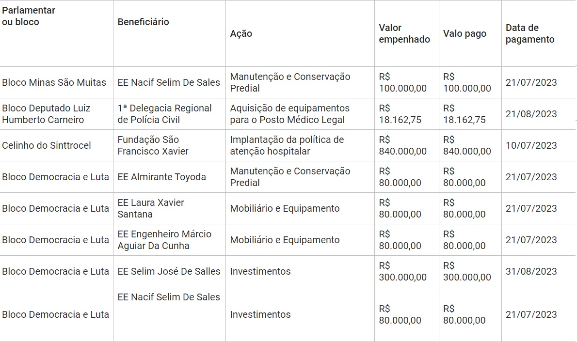 Os dados estão disponíveis no Portal de Emendas Estaduais e foram consolidados pela Plox. As verbas foram definidas ainda em 2022, portanto compreende os deputados da legislatura passada, como por exemplo, Rosângela Reis (PL), que assumiu uma cadeira na Câmara neste ano.