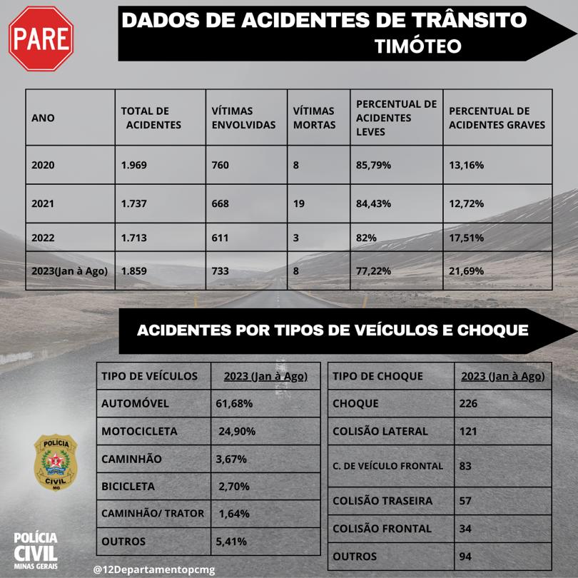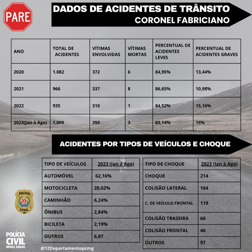 A Polícia Civil de Minas Gerais (PCMG), por meio do 12º Departamento, divulgou nesta segunda-feira (18), dia que inicia a Semana Nacional de Trânsito, dados sobre acidentes em sua área de abrangência, que inclui Ipatinga, Coronel Fabriciano e Timóteo, as principais cidades do Vale do Aço.