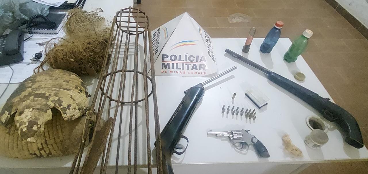 No decorrer das buscas, os militares encontraram um revólver calibre.22, uma chumbeira artesanal, uma arma artesanal calibre.32, duas redes de pesca, dois cascos de tatu, espoletas, uma quantidade de pólvora, chumbo, 18 munições calibre.22, uma munição calibre.22 deflagrada, uma munição calibre.32 e uma arataca.