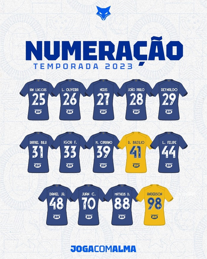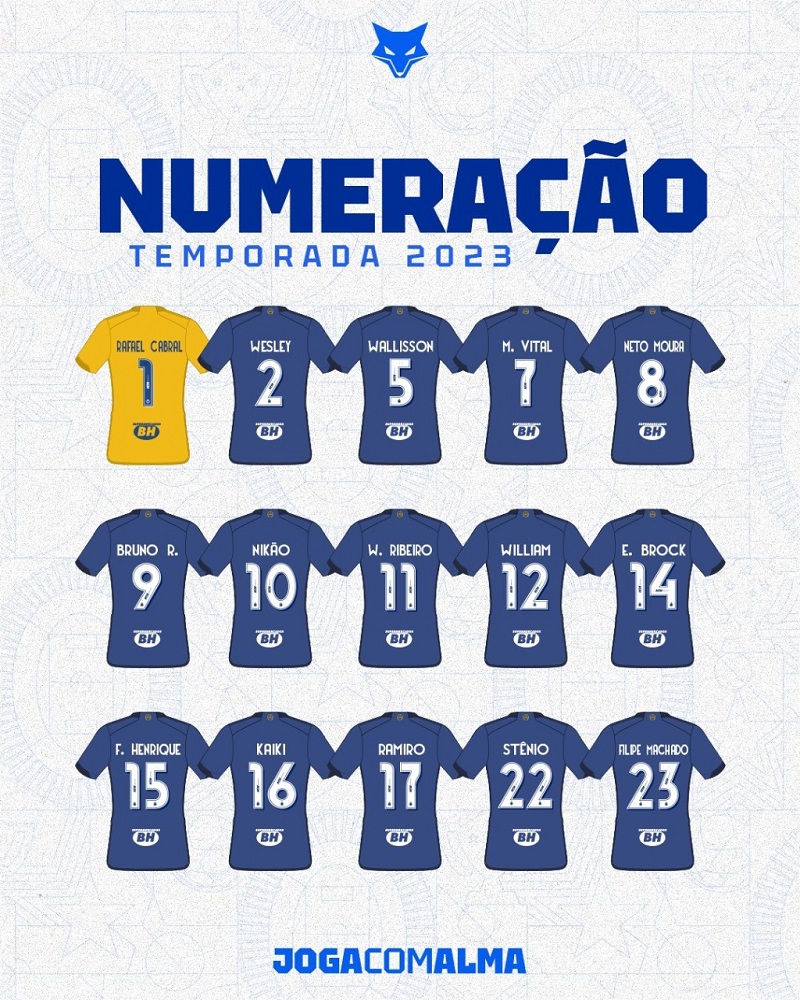 O Cruzeiro divulgou nesta quinta-feira (19) a numeração oficial dos atletas que fazem parte do plantel em 2023. Ao todo, 29 atletas já sabem que número irão ostentar na parte de trás do uniforme celeste.