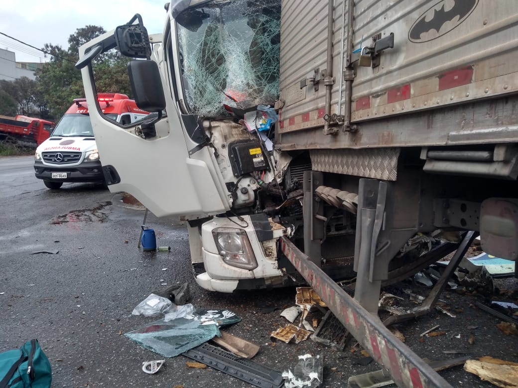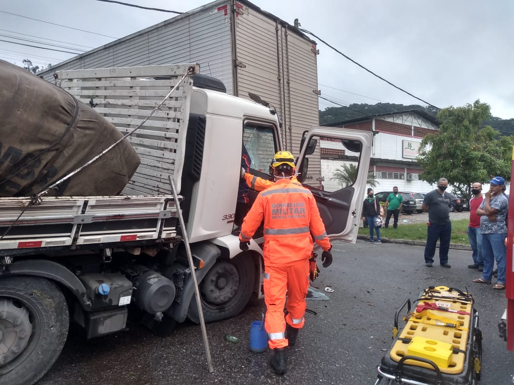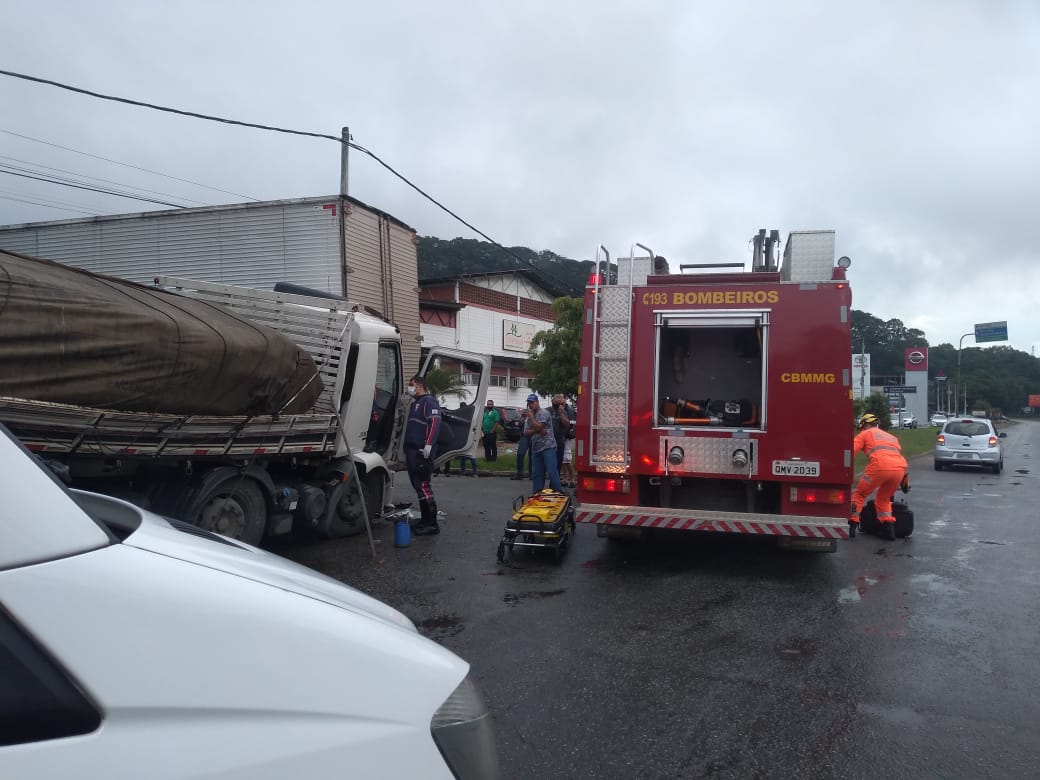 Na manhã desta segunda-feira (19), um caminhoneiro de 26 anos sofreu uma fratura completa na perna esquerda após se envolver em um acidente, batendo em dois caminhões, próximo ao Shopping do Vale do Aço, em Ipatinga-MG.
