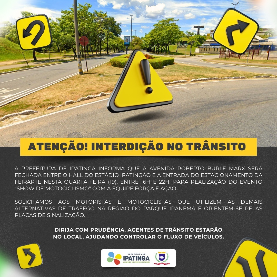 A Avenida Roberto Burle Marx, que passa pelo Complexo do Parque Ipanema, em Ipatinga, será fechada, nesta quarta-feira (19) no trecho entre o hall do Estádio Ipatingão e a entrada do estacionamento da Feirarte. Segundo a prefeitura, a interdição ocorrerá das 16h às 22h.