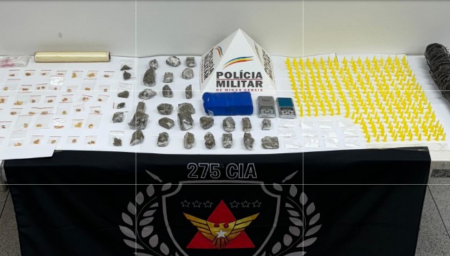 Um dos suspeitos foi interceptado, e, na busca pelo imóvel, foram encontradas 32 porções de maconha, uma barra de maconha, 42 pedras de crack, 12 papelotes de cocaína, 301 eppendorfs de cocaína, além de duas balanças de precisão.