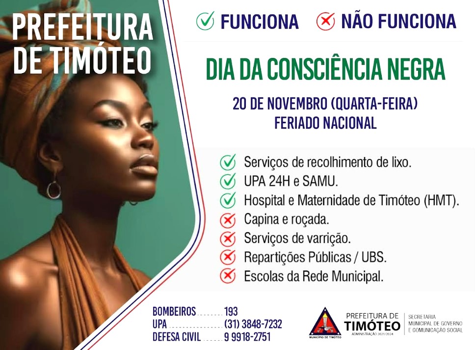 Nesta quarta-feira (20), Dia da Consciência Negra, as repartições públicas com serviço administrativo, escolas da rede municipal e unidades básicas de saúde estarão fechados em Timóteo, assim como a capina, roçada e varrição estarão suspensas.
