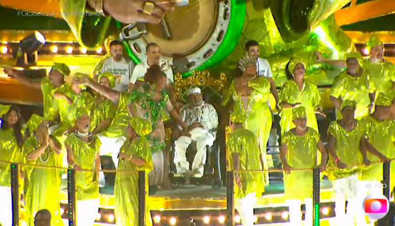 Arlindo Cruz desfilou sentado em um trono e as alas do desfile da escola contaram sua história e suas composições. Diversos famosos estavam no carro alegórico em que Arlindo estava, como os cantores Péricles e Marcelo D2, Júnior, ex-jogador do Flamengo e comentarista da Globo, Regina Casé, Hélio De La Penha, entre outros.