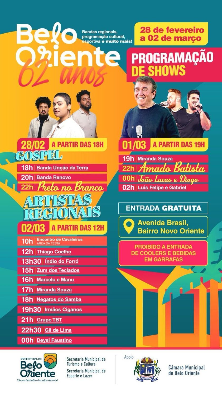 A cidade convida toda a população e visitantes para prestigiar essa grande festa, que promete celebrar com alegria e cultura os 62 anos de Belo Oriente!
