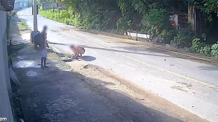 Na sequência, outra câmera registra a mãe tentando colocar o neném dentro de um bueiro. Uma mulher que passava pelo local percebe o risco em que a bebê estava, aborda o casal e recebe a criança, que lhe é entregue.