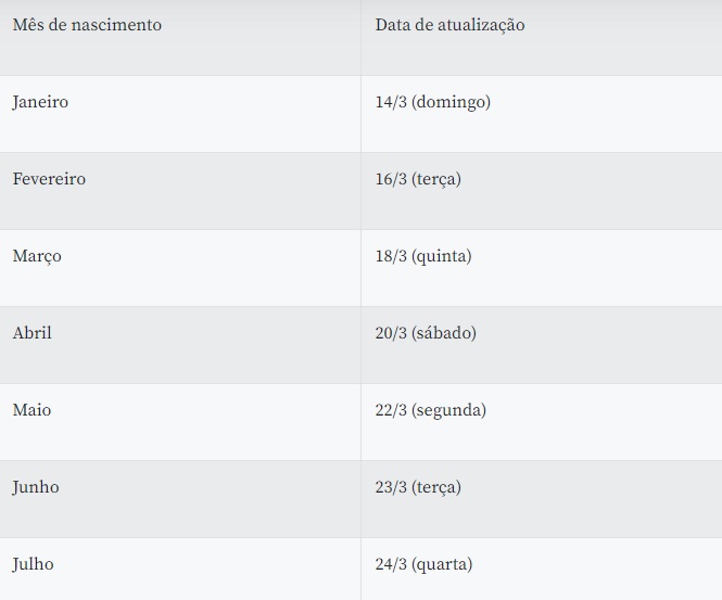 O calendário de atualização seguirá um cronograma escalonado, conforme o mês de nascimento dos clientes. O cronograma começou no último domingo (14) para os nascidos em janeiro e encerrará em 31 de março, para os nascidos em dezembro.
