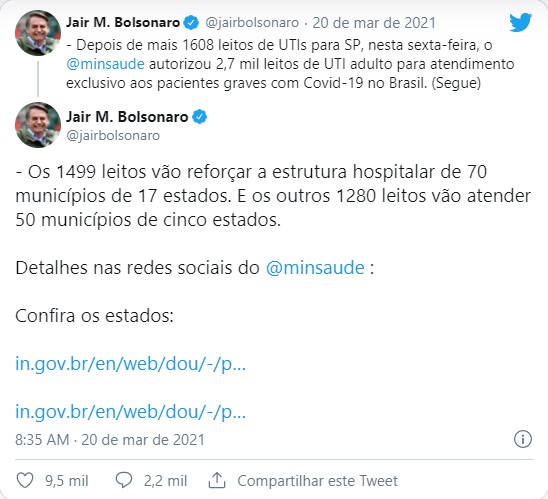 “A medida fortalece o Sistema Único de Saúde (SUS) e leva atendimento para a população em todo o país. Apesar de estados e municípios terem autonomia para criar e habilitar os leitos necessários, o Ministério da Saúde, em decorrência do atual cenário de emergência, disponibiliza recursos financeiros e auxílio técnico para o enfrentamento da doença. O objetivo é cuidar da saúde de todos e salvar vidas”, informou o ministério, em comunicado.