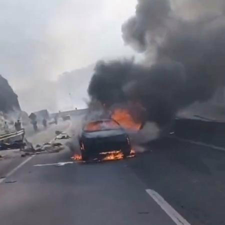 Bitrem com produto perigoso pegou fogo no km 273, sentido Rio de Janeiro; chamas atingiram outros veículos e a pista ficou interditada por cerca de três horas