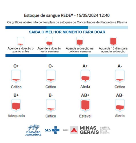 A Fundação Hemominas está convocando os mineiros para doar sangue. Os níveis críticos dos tipos sanguíneos O+, O-, A- e B- acendem o alerta. Atualmente, os estoques estão 30% abaixo do ideal, em média, sendo que a queda do tipo O positivo ultrapassa 50%. Segundo dados da Assessoria de Captação de Cadastro da Fundação Hemominas, apenas 1,8% dos mineiros são doadores de sangue regulares, sendo que a Organização Mundial da Saúde (OMS) recomenda que esse índice seja de, pelo menos, 3% da população. Saiba quem pode doar na Live.