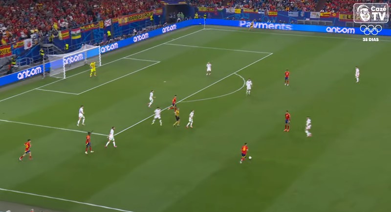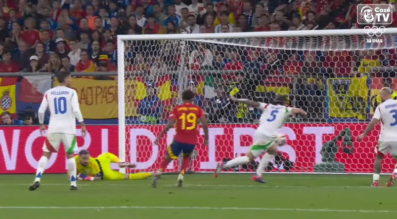 A Espanha dominou completamente o primeiro tempo, explorando a velocidade de seus pontas. Nico Williams e Lamine Yamal foram fundamentais na criação das jogadas mais perigosas. A Itália, por sua vez, apostou em contra-ataques que não se concretizaram. Enquanto os italianos só conseguiram finalizar nos acréscimos e sem perigo, a Espanha realizou nove chutes, quatro deles em direção ao gol de Donnarumma.