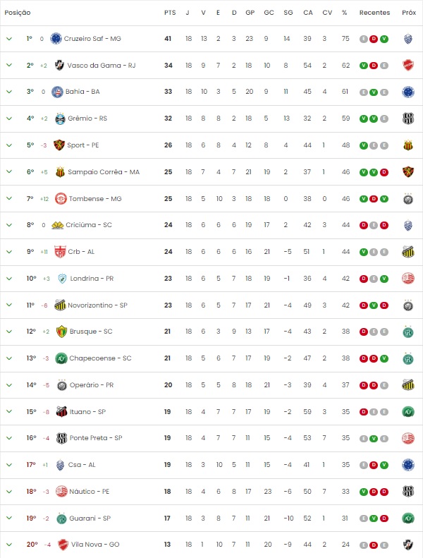 A 19ª rodada teve início na segunda-feira (18) com jogo de Sport e Vila Nova que terminou sem gols. O Grêmio jogou ontem contra o Brusque, fora de casa, e ficou no 1 a 1. Outra equipe do G4 que garantiu apenas um ponto foi o Bahia, que também ficou no 1 a 1 com o CRB. Não diferente dos demais, o Vasco recebeu o Ituano e terminou o jogo com um gol para cada equipe.