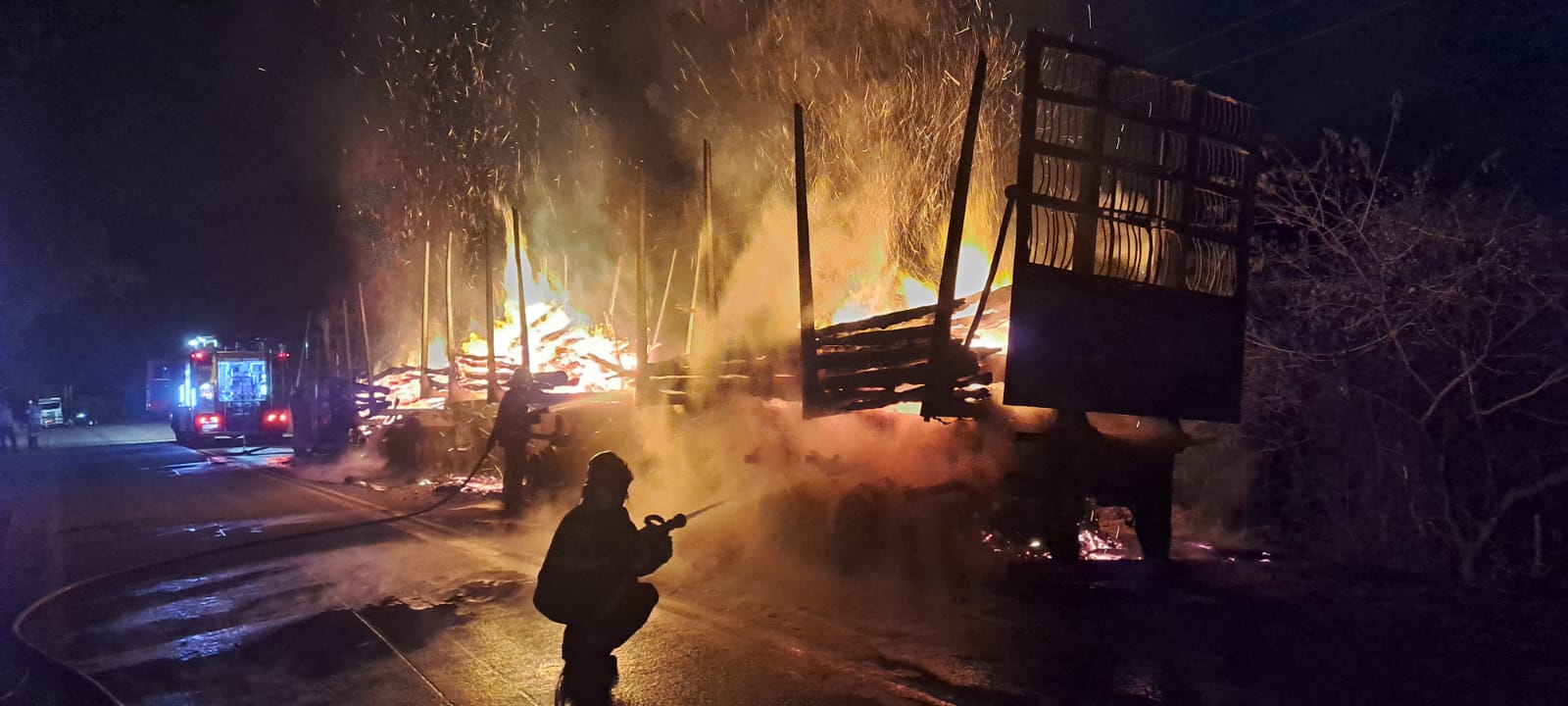 De acordo com informações do motorista, que conseguiu desacoplar o cavalo-trator sem danos, o incêndio começou após ele ouvir um barulho suspeito, possivelmente causado pelo estouro de um pneu. O fogo rapidamente tomou conta dos três semi-reboques carregados de madeira, e o extintor disponível no veículo não foi suficiente para controlar as chamas.