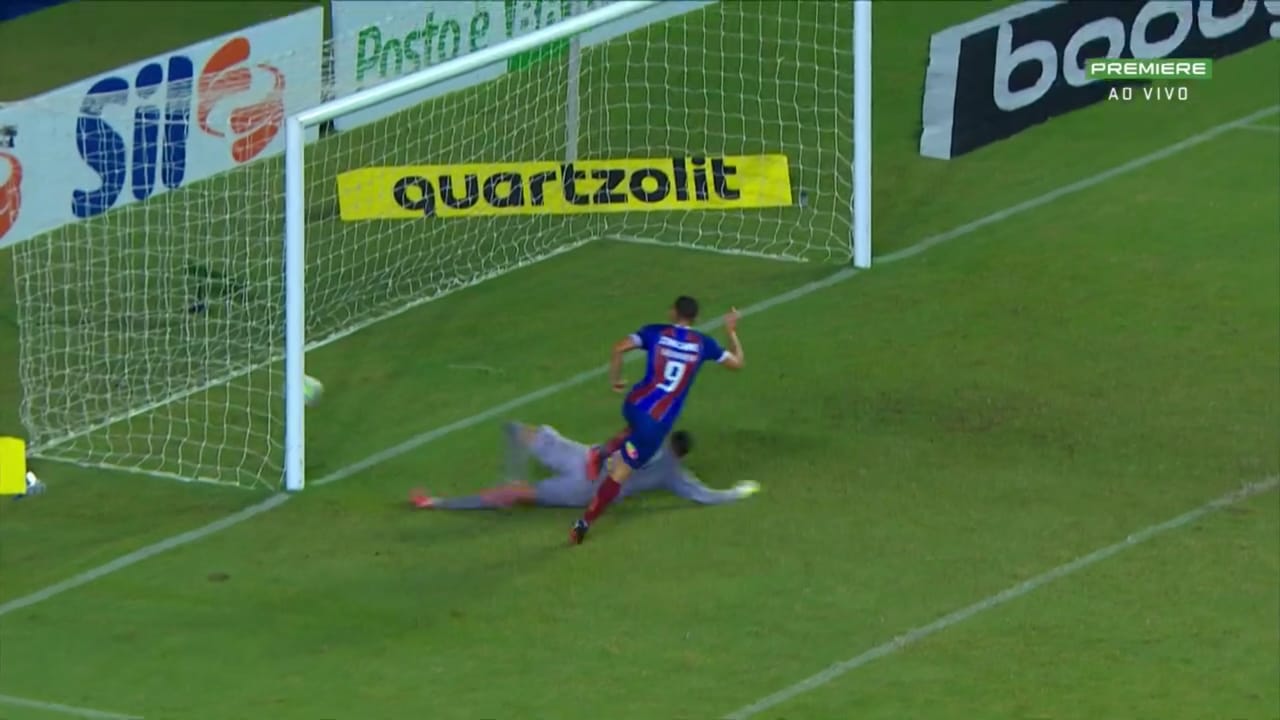 Em seguida, aos 12’ minutos, após a cobrança do escanteio, a bola sobrou para Keno, que estava na entrada da área do Bahia. Ele chutou e o goleiro baiano defendeu.