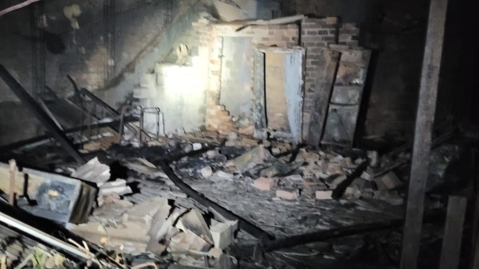 Casa é consumida por chamas e parte da estrutura desaba; ninguém ficou ferido