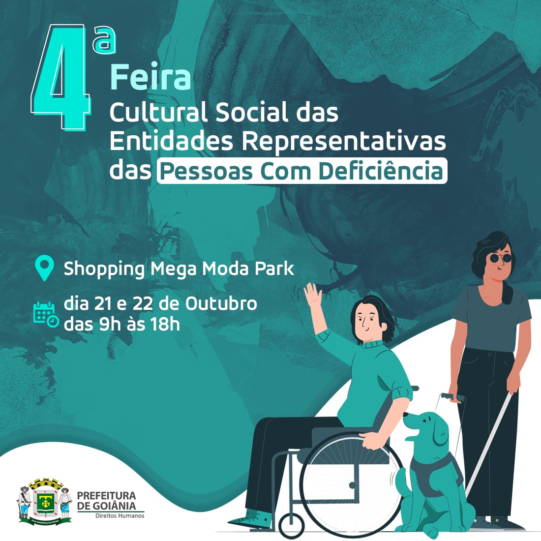 A Prefeitura de Goiânia realiza a 4ª Feira Social e Cultural das Entidades Representativas das Pessoas com Deficiência nos dias 21 e 22 de outubro, das 9h às 18h. A iniciativa da Secretaria Municipal de Direitos Humanos e Políticas Afirmativas ocorrerá no Shopping Mega Moda e contará com dezenas de produtos, apresentações e stands organizados por associações, grupos e entidades que representam os direitos das Pessoas com Deficiência.