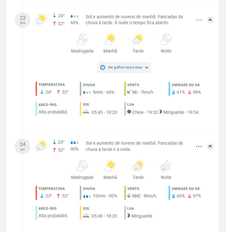 Na quarta, a previsão é de que não tenha chuva, porém, as precipitações devem voltar na quinta-feira. Veja a previsão para esses dois dias.