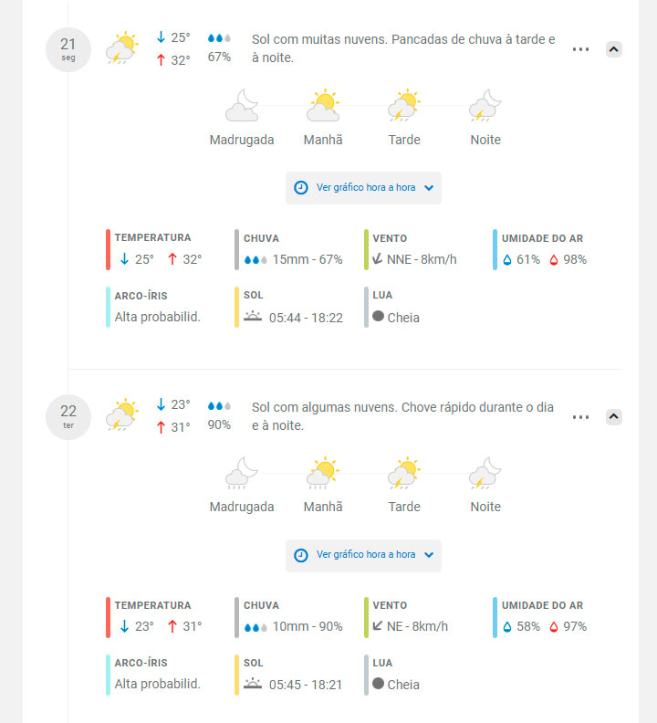 De acordo com o site Climatempo, apenas na quarta-feira (23) que não deve ter chuva. Mesmo com as precipitações, a tendência é que a temperatura não caia, ficando entre a mínima de 23ºC e a máxima de 33ºC, como foram registradas nos últimos dias. Veja a previsão para esta segunda e terça-feira (22).