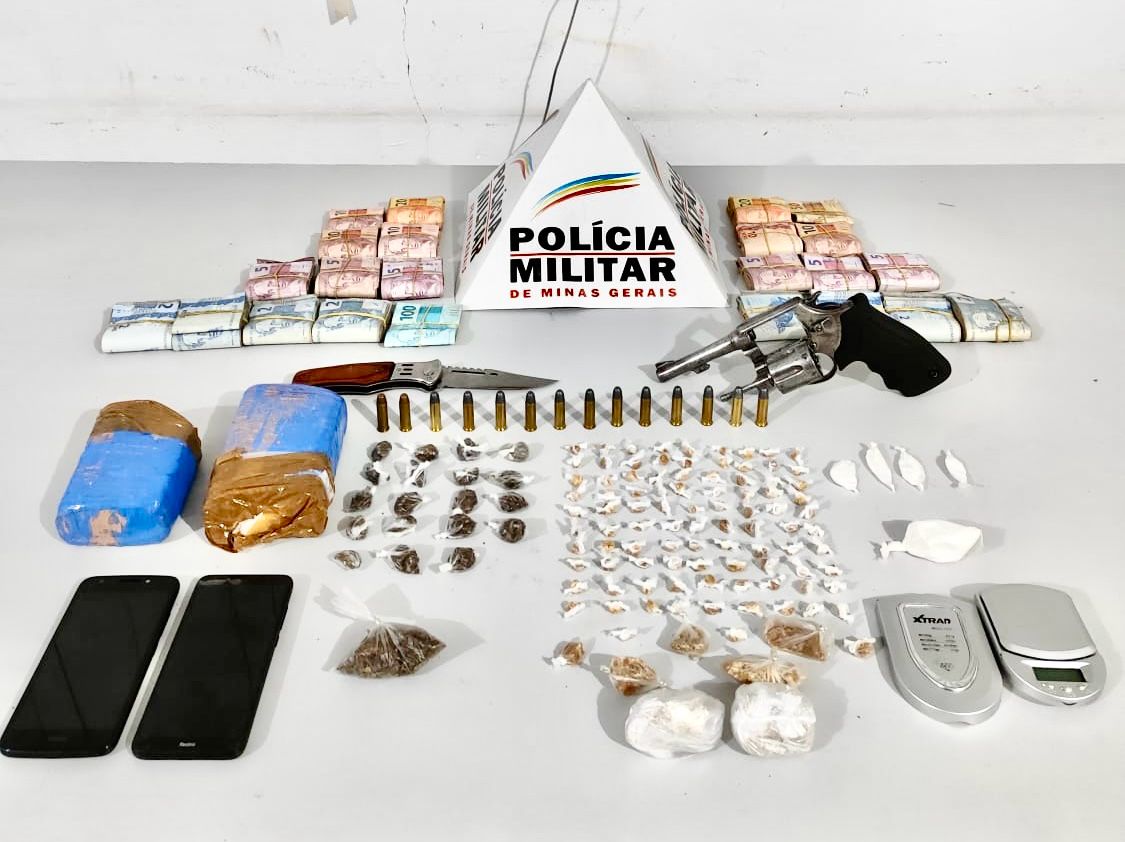 A lista de materiais apreendidos é extensa: um revólver calibre .38, 14 cartuchos do mesmo calibre, uma porção de cocaína, quatro papelotes da mesma droga, uma porção e 19 buchas de maconha, duas barras e mais oito porções da substância, um total de 103 pedras de crack, dois celulares, uma balança de precisão, duas facas tipo canivete e R$ 8.746,00 em espécie. Além dos itens relacionados ao narcotráfico, uma motocicleta Honda Titan vermelha também foi apreendida durante a operação.
