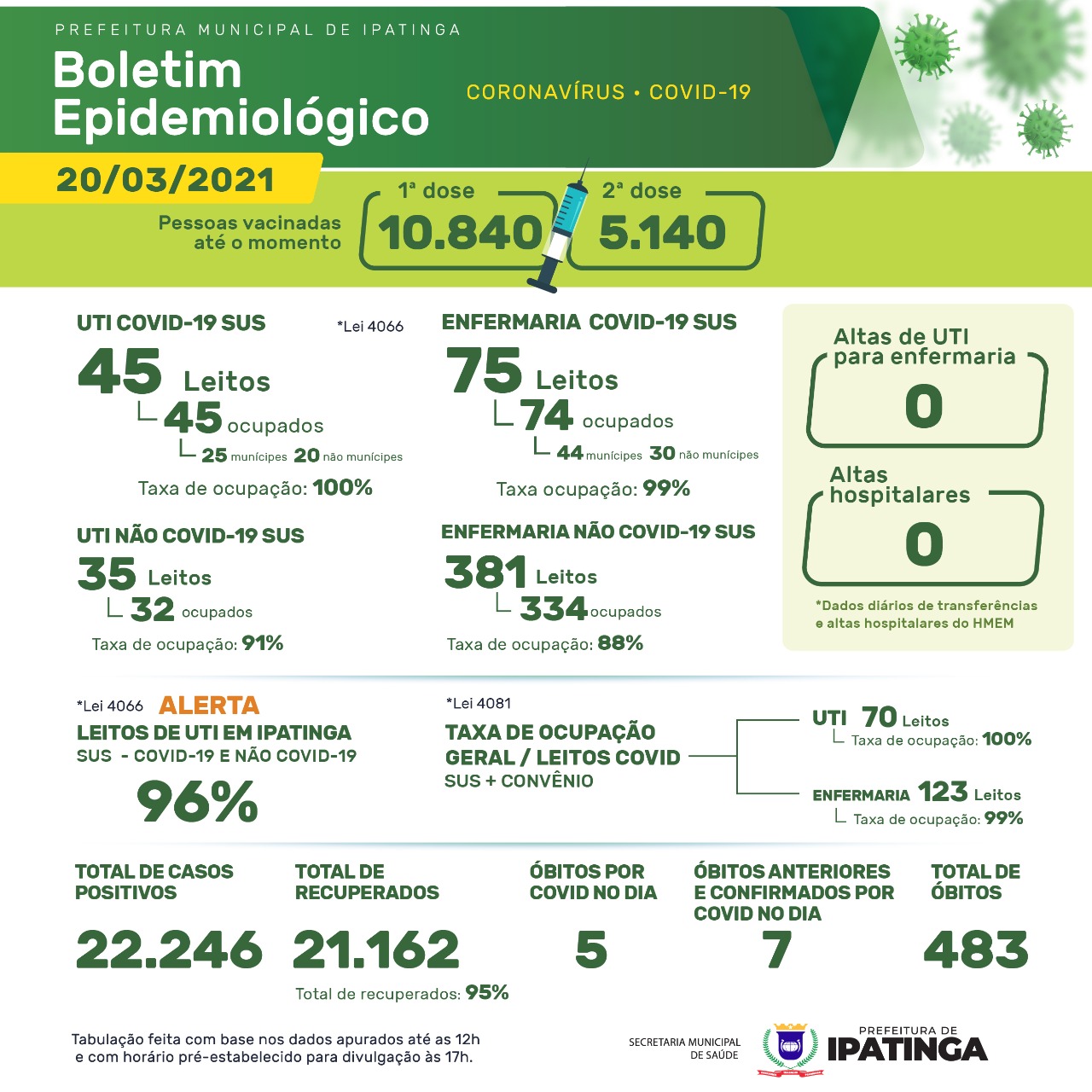 Segundo informações da administração municipal de Ipatinga, o município já chegou a marca de 483 mortes por complicações da Covid-19. Até o momento, a cidade já teve 22.246 pessoas contaminadas com a doença. A taxa de recuperação está em 95%, o que representa 21.162 pacientes recuperados da covid-19.