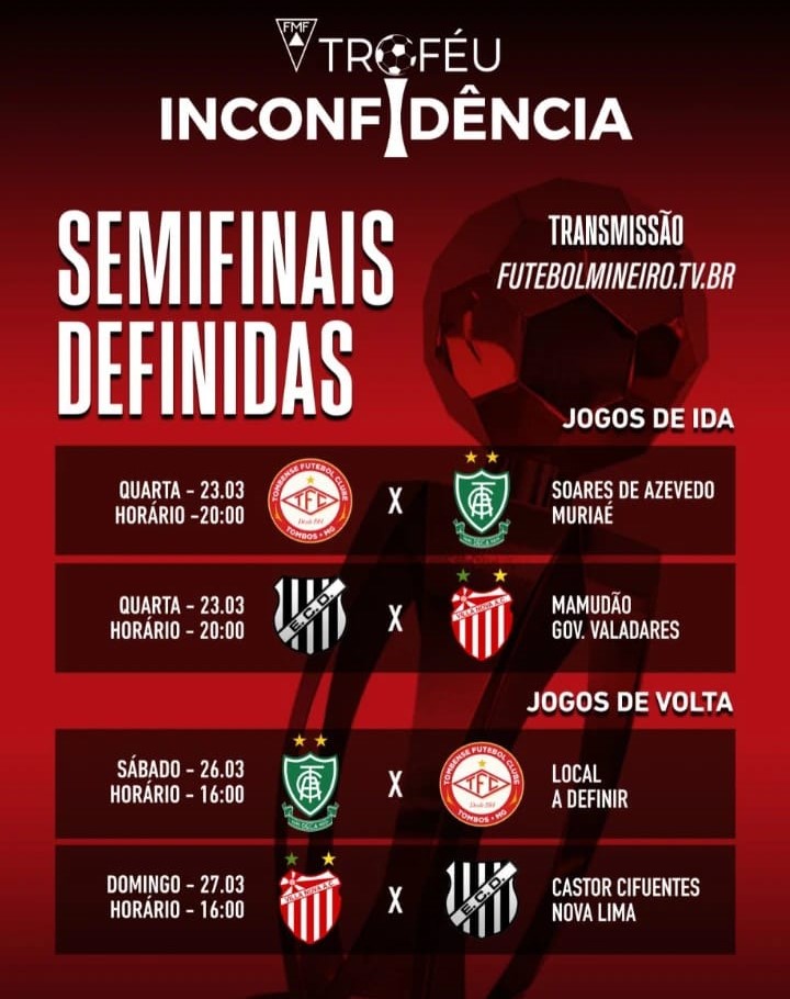 Neste domingo (20), a Federação Mineira de Futebol (FMF) divulgou os confrontos da semifinal do Troféu Inconfidência, para os times que ficaram entre a 5ª e a 8ª colocação do Campeonato Mineiro 2022.