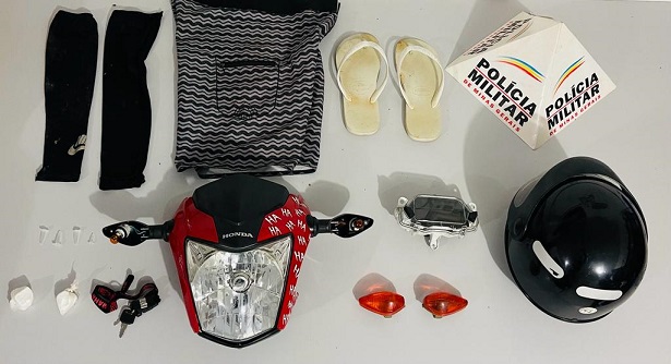 No local da abordagem, os policiais realizaram buscas e encontraram a motocicleta Honda CG Titan, de cor azul, usada no crime, o capacete utilizado pelo condutor do veículo, a chave da moto, vestimentas, além de porções de cocaína e material destinado ao embalo de drogas. Todos os itens foram apreendidos como evidências do crime.