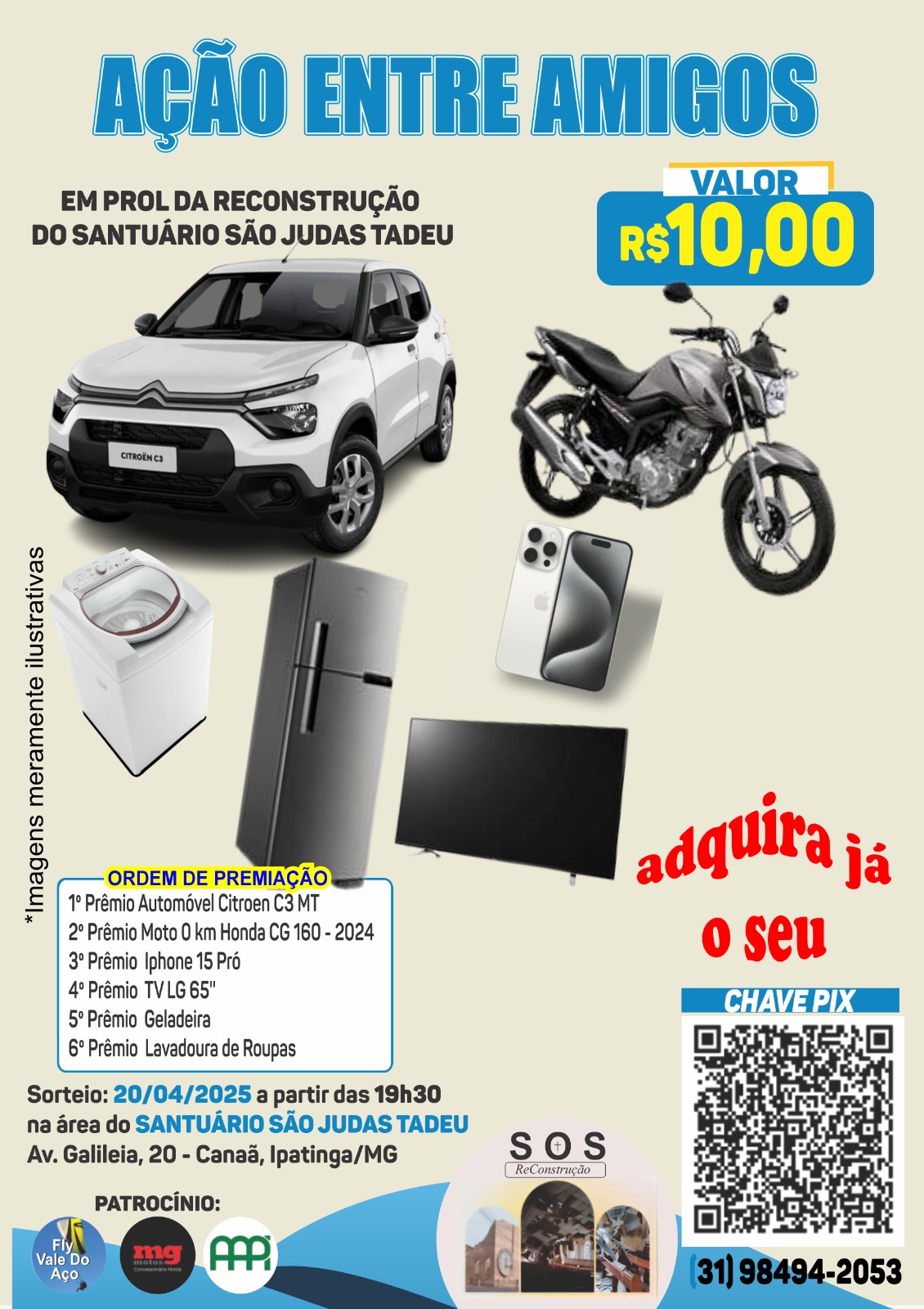 Os participantes poderão adquirir bilhetes da campanha pelo valor de R$ 10,00, contribuindo assim para a reconstrução do Santuário São Judas Tadeu.