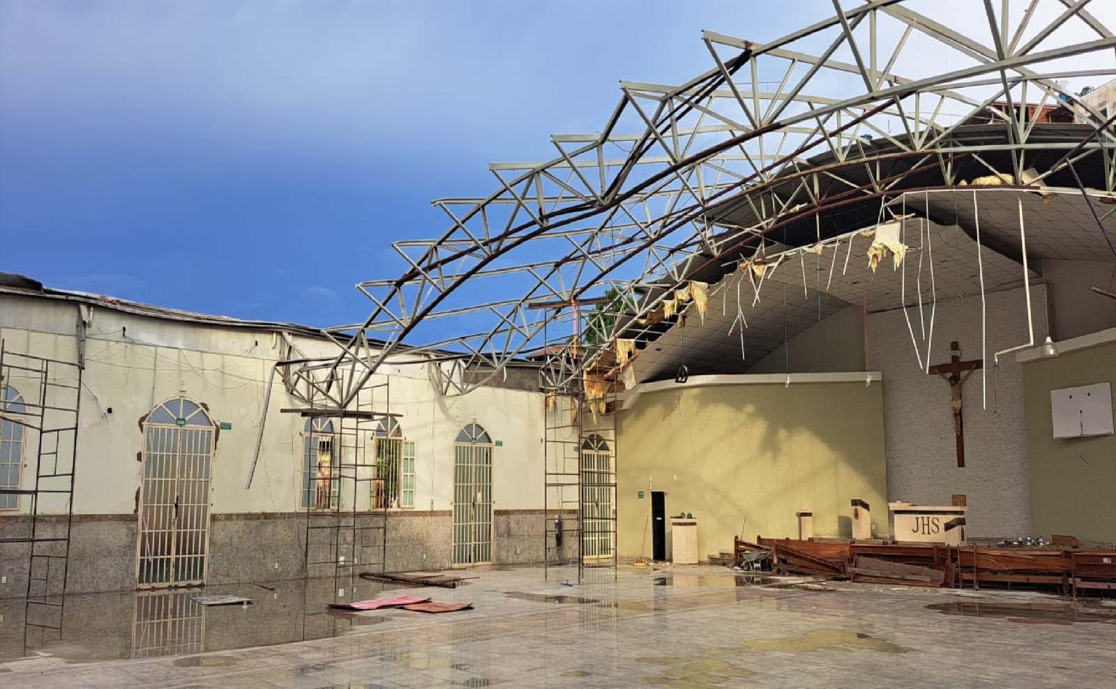 O Santuário São Judas Tadeu, no bairro Canaã, em Ipatinga, chegou a ser interditado pelo Corpo de Bombeiros, após o teto desabar na tarde do dia 26 de dezembro após um temporal atingir o Vale do Aço. A informação foi passada ao Plox pela auxiliar administrativa da Paróquia Cristo Libertador, Maria da Conceição Oliveira. Ela estava na secretaria, que fica ao lado do Santuário, quando a igreja foi atingida por um raio e por fortes ventos. Por sorte não havia ninguém no local. Acompanhe as imagens de como ficou o local depois do desabamento.