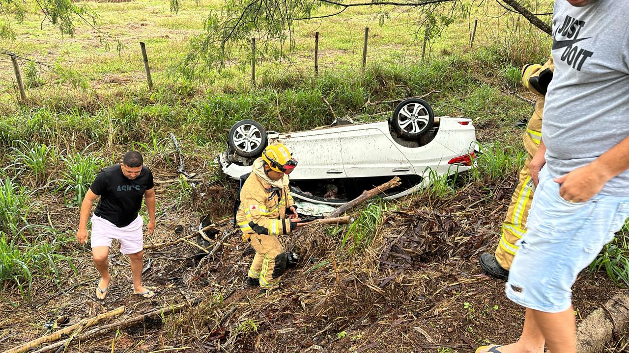 Carro capota e atinge árvore após cair em ribanceira