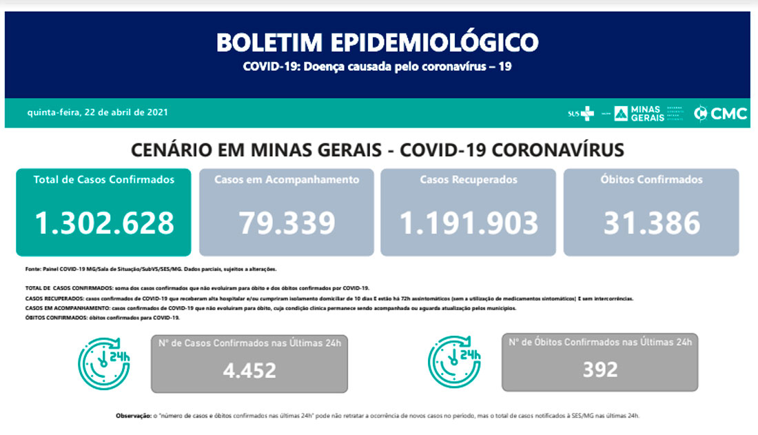 Nesta quinta-feira (22), o Governo de Minas Gerais, por meio da Secretaria Estadual de Saúde (SES-MG), divulgou o Boletim Epidemiológico Diário da Covid-19 no estado.