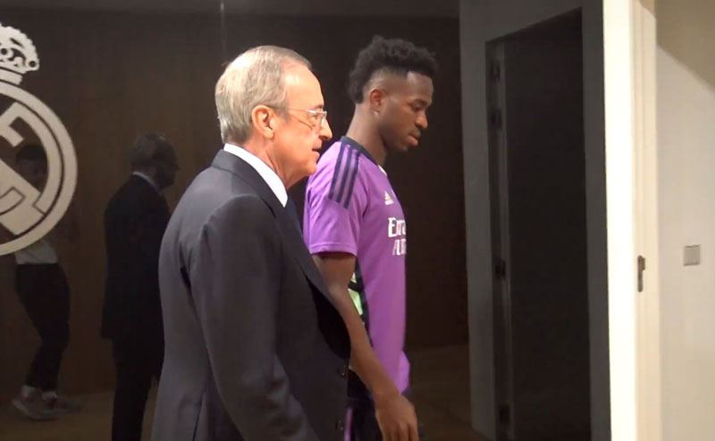 Florentino Pérez, presidente do Real Madrid, e Vinícius Jr. Foto: reprodução/ Twitter/ Real Madrid