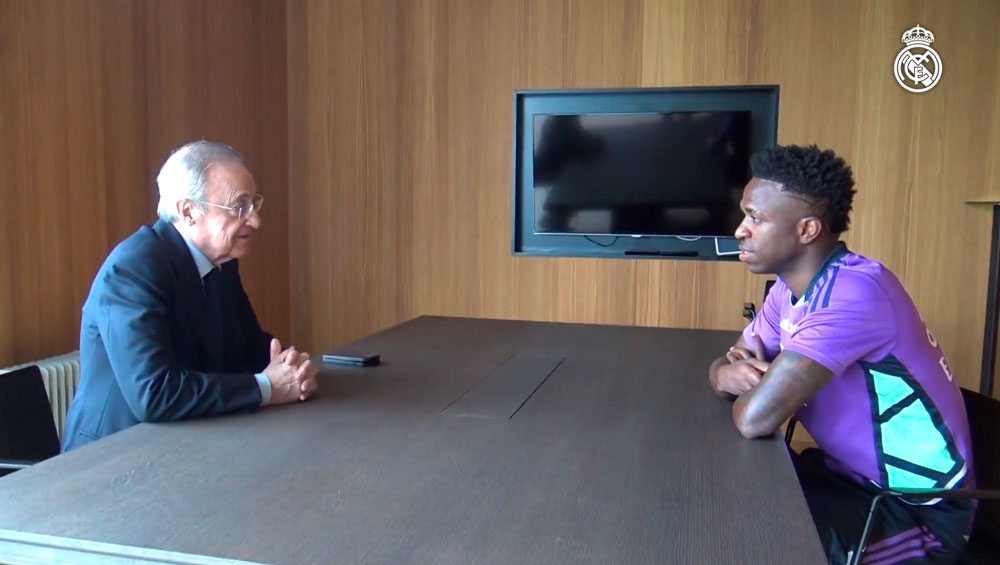 Reunião entre Pérez e Vinícius Jr. Foto: reprodução/ Twitter/ Real Madrid