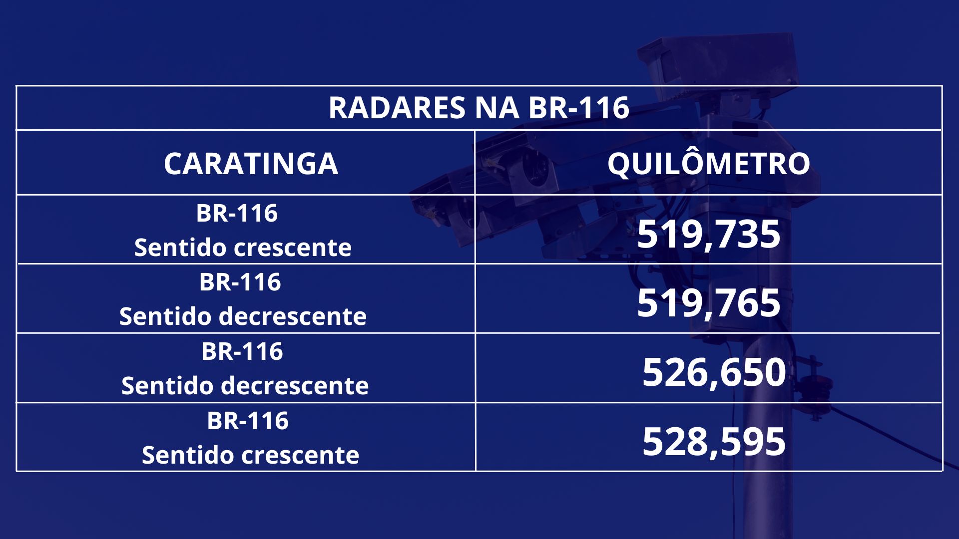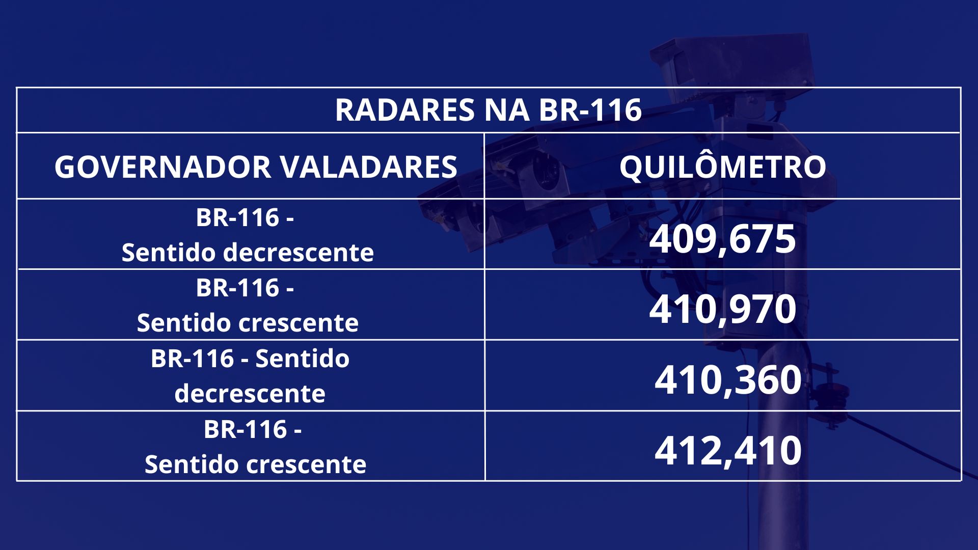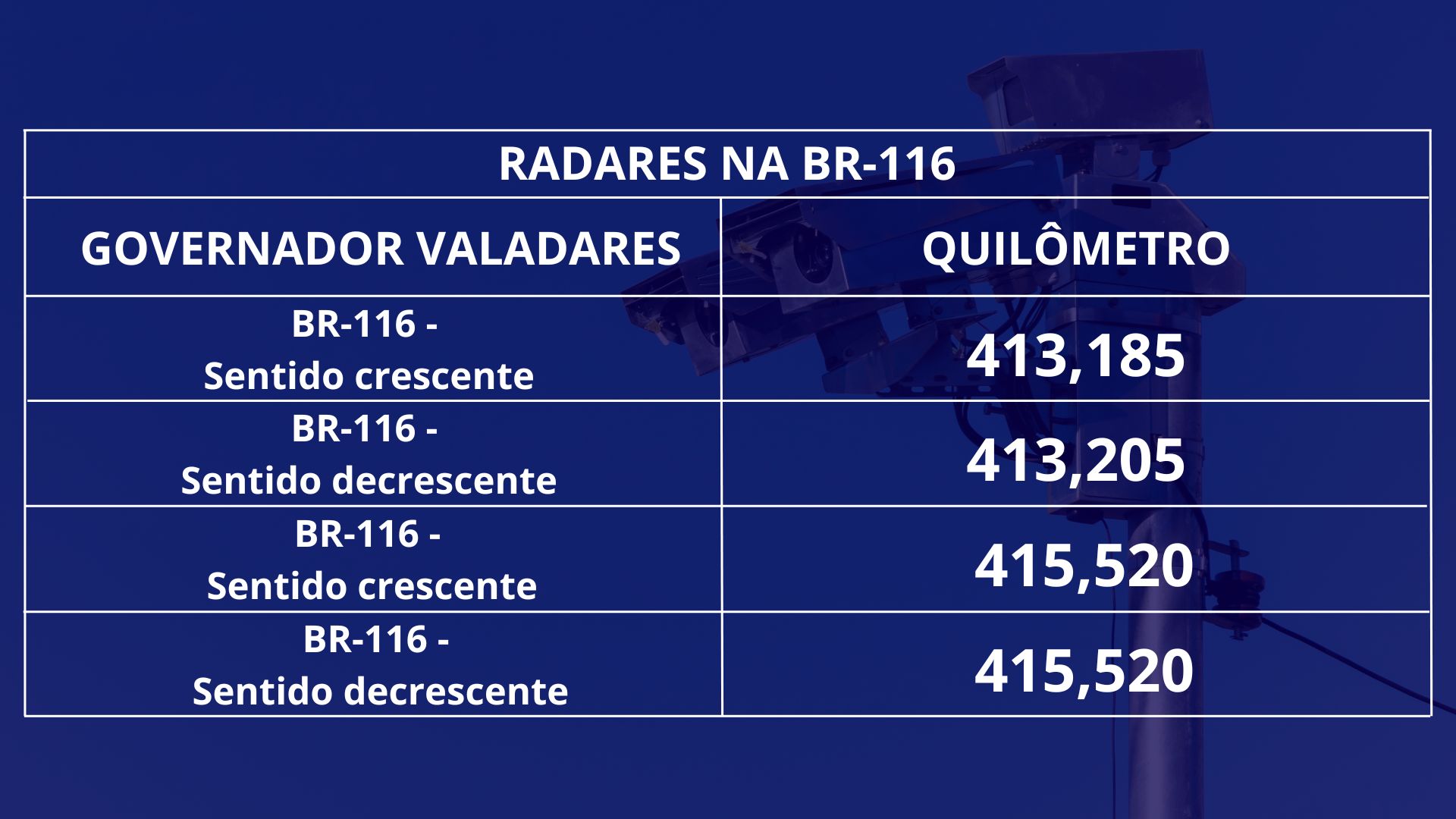 Começaram a funcionar nesta segunda-feira (22) radares fixos instalados na BR-116, em Minas Gerais e no Rio de Janeiro. Na região Rio Doce, popularmente conhecida como Leste de Minas, os novos equipamentos estão ativos em trechos específicos da rodovia em Governador Valadares, Inhapim e Caratinga. Veja na Live os quilômetros onde os aparelhos de fiscalização estão fixados.