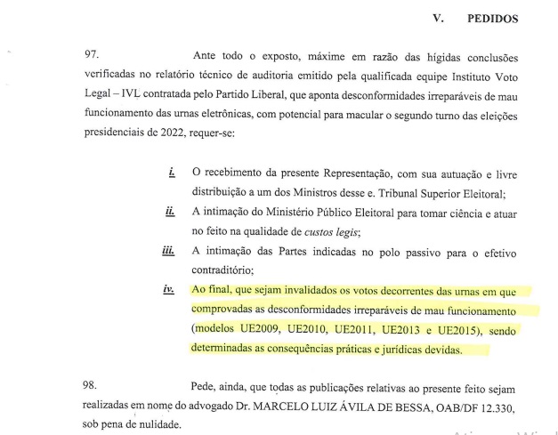 O relatório técnico foi elaborado pelo IVL (Instituto Voto Legal). De acordo com o levantamento, mais de 300 mil urnas tiveram problemas durante as votações do segundo turno, no dia 30 de outubro. Os advogados alegam que houve "desconformidades irreparáveis de mau funcionamento" em cinco modelos de urnas fabricadas nos anos de 2009, 2010, 2011, 2013 3 2015. De acordo com eles, essas inconformidades podem ter alterado o resultado das eleições.