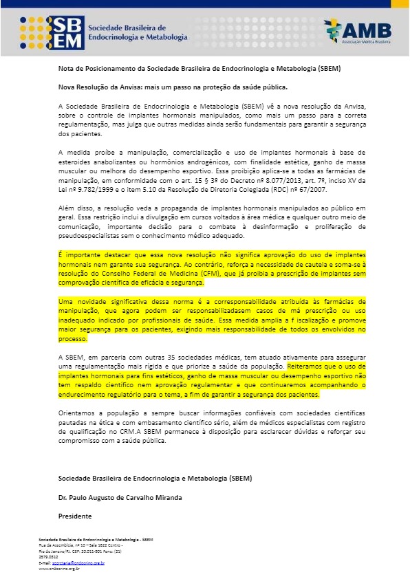 A Sbem também elogiou a proibição de propaganda dos implantes hormonais manipulados, destacando que a medida é essencial para frear a disseminação de informações enganosas, sobretudo nas redes sociais. Segundo a entidade, a proliferação de "pseudoespecialistas" tem gerado desinformação e levado pacientes a optar por tratamentos sem comprovação científica adequada.